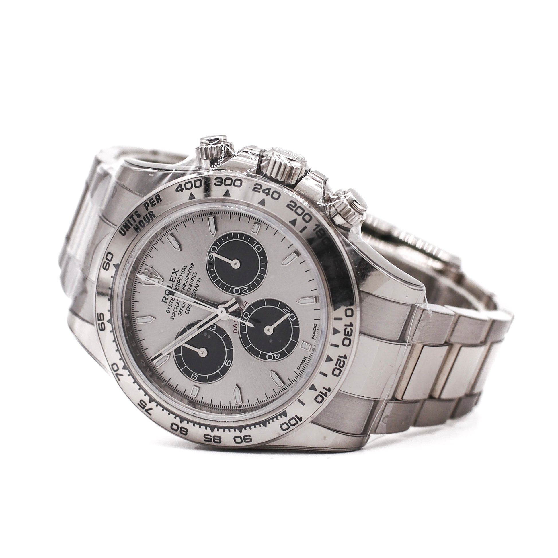 The solid-link Oyster bracelet with an Oysterlock safety clasp provides a secure and comfortable fit for the wearer.With its combination of exquisite design, impeccable craftsmanship, and cutting-edge technology, the Rolex 126509 Daytona Full White Gold Silver dial epitomizes the pinnacle of luxury chronograph watches.
