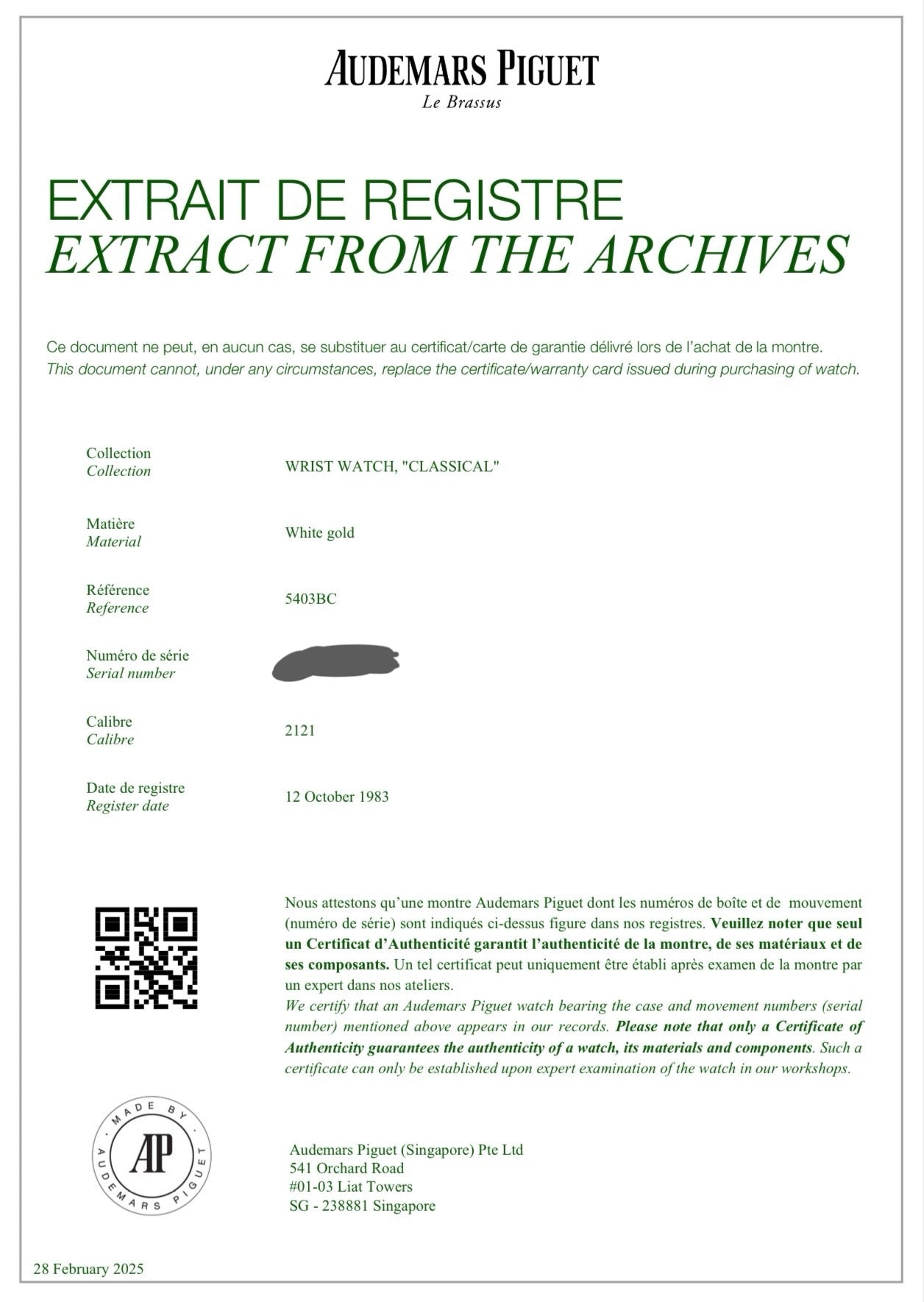 Box/Papers: No / Yes (With Audemars Piguet Archive Papers)